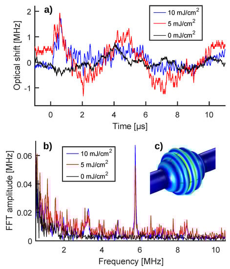 (a) Optical shifts induced in the WGM resonance by environmental noise (black curve) and by a PA wave (blue curve) as deduced from the raw transmission signals shown in Figure 2c keeping the same color code. The shift produced by a 5 mJ/cm fluence pulse is added for comparison (red curve). (b) Fourier spectrum of the optical shifts reported in panel (a), keeping the same color code. (c) Deformations of the MBR walls (in arbitrary units) for a breathing mode close to 5.75 MHz, as deduced by solving the eigenvalues problem for the MBR system through COMSOL Multiphysics®. Blue means less deformation, while yellow means more deformation.