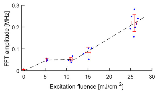 Finally, to demonstrate a quantitative reconstruction of the PA intensity through the height of the main peak at 5.75 MHz, we plotted this quantity against pump laser fluence in Figure 4. The typical photostability trend of GNRs can be recognized: a linear regime (up to about 5 mJ/cm), when GNRs are stable under excitation and the PA response is linear with their absorbance; a sub-linear regime (5–10 mJ/cm) associated with the onset of GNR reshaping [42,43]; a third regime (10–30 mJ/cm), associated with the onset of cavitation regime, where shockwaves are produced through water evaporation in proximity of the GNRs [44]. Additionally, we challenged the MBR system by reducing the GNR concentration, obtaining an overall linear scaling of the photostability curve and therefore demonstrating sensitivity towards the concentration of the contrast agent (see Figure S2 of the Supplementary Materials).