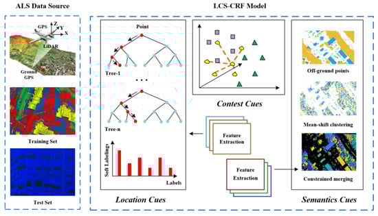 Flowchart of the location-context-semantics-based conditional random field (LCS-CRF) algorithm integrating location, context, and semantics cues. ALS = airborne laser scanning.