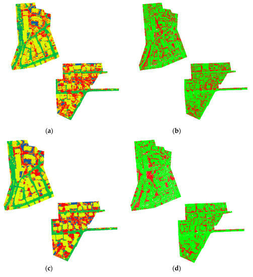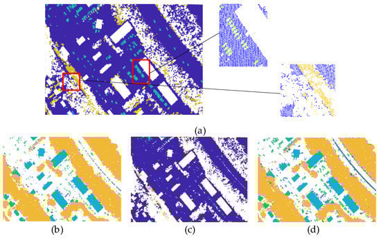 Results contrast between Cloth Simulation Filter (CSF) and Algorithm 1: (a) Ground points obtained from CSF algorithm. Details of misjudgment are also shown; (b) off-ground points obtained from CSF algorithm. Much information of small size objects is lost; (c) ground points obtained from Algorithm 1. Error samples between ground and classes are obviously refined; (d) off-ground points obtained from Algorithm 1. Enough information of small size objects, which directly affects the results, can be provided by higher-order potential.