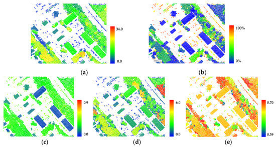 Cluster-based features: (a) height ; (b) distribution of ground points ; (c) roughness ; (d) compactness ; (e) normal correlation .
