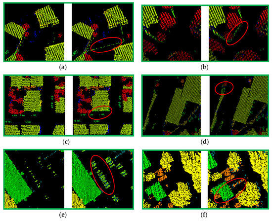 From Table 3, we can observe that the OA of LCS-CRF model performs the best among all of the traditional machine learning based method. As far as the eight specific classes are concerned, our method ranks first in the imp_sur, car, and shrub classes within the traditional machine learning-based methods, and its P surpass previous highest results with absolute advantages (+1.1%, +2.6%, and +6.1%). The RF model is mainly based on the point-based features, which are derived by the location cues of points, to perform semantic classification for ALS data. The CRF model integrates the location and contextual cues and shows a smoother result compared with the RF model (as shown in Figure 11). Obviously, the LCS-CRF model shows a superior result by incorporating location, context, and semantics cues into a higher CRF model. Especially for the car class, a great improvement of P is obtained by adding semantics cues. The class low-veg, with a higher P, mainly benefits from Algorithm 1. The OA of the LCS-CRF model ranks first among the traditional machine learning-based methods and third among the deep learning-based methods, with minor disadvantages (1.8% and 2.1% lower than the second and the first OA, respectively). Though some deep learning-based methods perform better than our method, the LCS-CRF model can also satisfy the general demand with less training costs.
