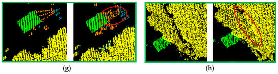 Comparison of CSF method with our off-ground points filtering method: (a–d) More façade points, car points, etc., can be integrated into off-ground points for Vaihingen Dataset; (e–h) more car points, vegetation points, etc., can be integrated into off-ground points for GML Dataset A.