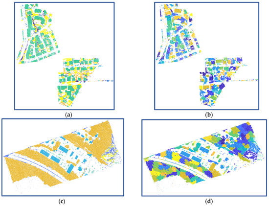 Filtered and clustering results of off-ground points from two ALS datasets: (a) off-ground points of Vaihingen Dataset obtained with Algorithm 1; (b) clusters of (a) obtained with Algorithm 2; (c) off-ground points of GML Dataset A obtained with Algorithm 1; (d) clusters of (c) obtained with Algorithm 2.