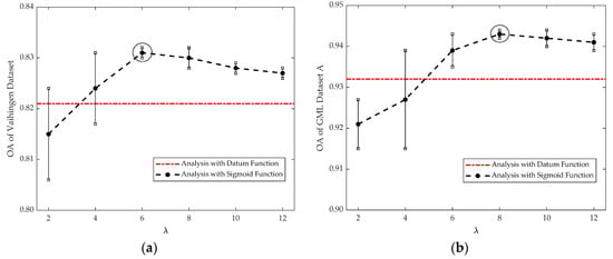 We can observe that, the OA first increases as parameter increases since the semantic rules are properly utilized with Sigmoid functions to enhance the discrimination of cluster-based features. Then, the OA no longer increases at a certain value of parameter (i.e., around 6 for Vaihingen Dataset and around 8 for GML Dataset A), and even shows a slight decreasing trend, since the large varying degrees of cluster-based features can lead to the accumulation of noise from cluster-based features and cause misjudgments of clusters. The red dotted lines in Figure 16, serving as a reference, represents the classification results based on the higher-order potentials derived by datum function.