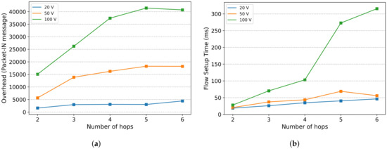 Figure 3a,b show respectively, the overhead and the average flow setup time as a function of the number of hops and the number of vehicles.