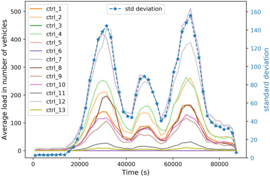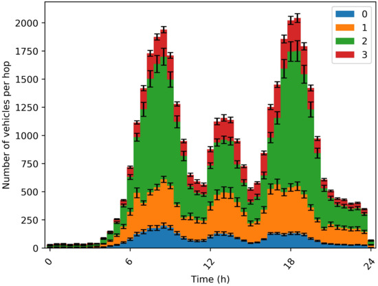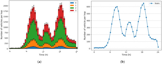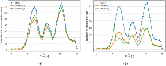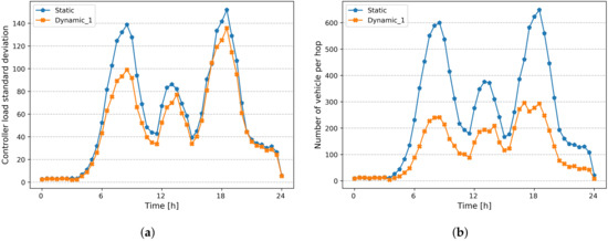 Figure 10a,b show respectively, the standard deviation of controller load and number of vehicles located at 3 hops, for both static and dynamic placement strategies. We can notice that the number of vehicles at 3 hops decreases from an average around 600 to 250 vehicles, during rush hours, thanks to the readjustment of controller placement. Furthermore, adding new controllers results in a reduction of the standard deviation of controllers’ load, as shown in