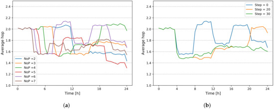 Figure 14a shows the model performance in terms of average hops, with various T values (i.e., number of placement
