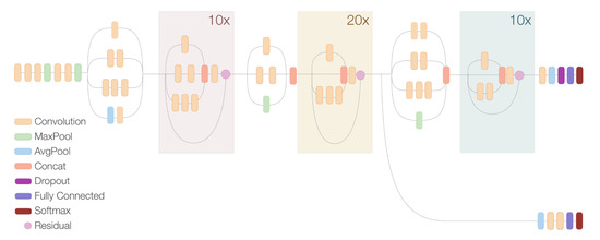 Due to the high number of layers, the loss becomes small and insufficient to update the kernel values properly. To prevent the middle part of the network from “dying out” during the backpropagation process, an auxiliary classifier is applied at the output of the second block of Inception-ResNet modules. In this way, an auxiliary loss is computed and added to the prior one as shown in Equation (1).