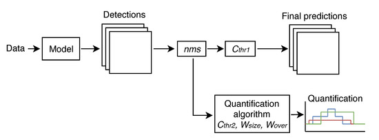 Furthermore, if the initial source of data is a video sequence, the network detection can be forwarded into the quantification algorithm to obtain the evolution of number and species of jellyfish present on the video sequence. This algorithm first deletes instances with an associated confidence lower than a selected threshold value () and then applies time series processing techniques. More in depth information about the quantification algorithm is provided in Section 4.6.