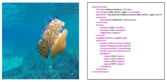 To log the presence of the different jellyfish species, annotation files were generated using the LabelImg tool [61]. For each image, a bounding box around each jellyfish instance was drawn and was classified according to its species. The LabelImg tool then generates an “.xml” file containing the position and classification of each instance within the corresponding image. A total of 962 jellyfish occurrences were recorded, 327 corresponding to Pelagia noctiluca, 292 to Rhizostoma pulmo and 343 to Cothyloriza tuberculata. Figure 4 shows an original image along with its ground truth “.xml” text file.
