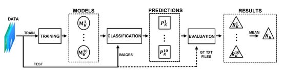 From these predictions, each model is evaluated in terms of detection performance, obtaining its results metrics . Finally, the detection performance of each experiment is computed as the mean of its ten models performance. The best model M corresponding to the experiment that presented the best results is selected to generate the quantification and monitoring predictions. The validation process of the experiments is shown in Figure 5.