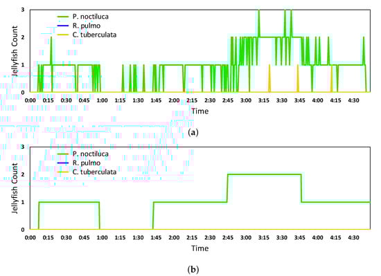 After training the network and selecting the best hyperparameter values and combination, we assessed the capability of the network at real-time jellyfish monitoring tasks. To do so, a video sequence was manually labeled, indicating the number and classes of jellyfish present at each frame. Subsequently, the same video was analyzed by the neural network. Each time that the network was able to analyze a frame for the video sequence, it generated a predicted information point, containing the number and classes of jellyfish present at the analyzed frame.