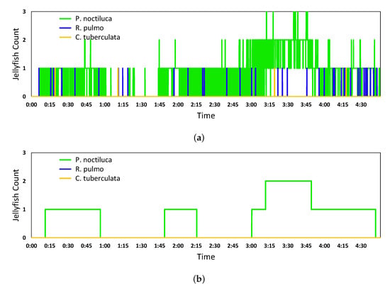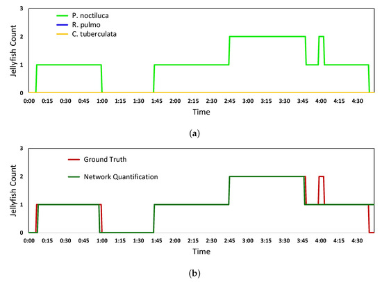 Results of the jellyfish count from the Inception V2 network final predictions (a) and quantification algorithm (b).