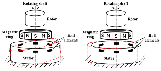 The absolute magnetic encoder is used in the joint module. Compared with the grating encoder, the magnetic encoder has the advantages of simple structure, fast response speed, strong resistance to environmental interference, easy integration in digital circuits and wide use in speed and position detection [26]. Based on the pole pairs in the magnetic ring, magnetic encoders can be divided into single-pole and multi-pole encoders. In single-pole magnetic encoders, the magnetic ring rotates for one circle and the Hall element outputs a sinusoidal signal of one period. To obtain a higher resolution, the original signal frequency must be multiplied. By the design of different distribution of Hall sensors in single-pole magnetic encoders, the original analog signals of different initial phases can be obtained and the calibration and look-up table subdivision algorithm can be introduced to solve the angle. After the single-pole encoder resolution is improved to a certain degree by algorithm, it is difficult to improve further, but increased magnetic poles can make the resolution subdivision more detailed. Presently, there already is the design of absolute multi-pole magnetic encoder with index track and subdivision track combined [27]. For the multi-pole magnetic encoder, which needs to process continuous analog signal to achieve continuous angular output, the region must be divided and the location of the region determined according to the magnetic pole distribution. Therefore, the positioning error of pole distribution of the magnetic ring will be considered during the manufacturing process. The magnetic encoder signal is generated by the relative displacement of the Hall elements and the magnetic ring; therefore, the accuracy of the relative position of the Hall elements and the magnetic ring affects the encoder output signal accuracy. In the manufacturing and installation process of the signal generating part, tilt and eccentricity between the Hall elements and the magnetic ring (as shown in Figure 1) will inevitably introduce low-frequency error into the generated signal. Eccentricity will cause first-order harmonic error, and tilt will lead to second-order harmonic error [28]. Some subdivision error will also cause high-frequency error [29]. The error is generally periodic, therefore the harmonic analysis method should be adopted.