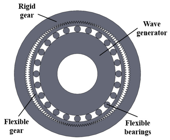 Compared with other mechanical transmissions, the harmonic reducer achieves greater transmission ratio, higher accuracy, lower noise and better working stability with fewer parts, smaller size and lighter weight [30]. The harmonic reducer generally comprises a rigid gear, flexible gear and wave generator and the transmission method of this assembly is based on the principle of elastic deformation. Figure 2 shows the reducer used in this experimental platform. One of the three basic components is generally fixed while the others are drive and driven components. When the rigid gear is fixed, the wave generator drives and the flexible gear is driven. The wave generator is installed in the flexible gear, then the wave generator cam generates a deformation wave that is transmitted to the flexible bearings and then transmitted to the flexible gear, causing deformation. With the continuous rotational deformation of the wave generator, the flexible gear will also generate periodic elastic deformation and the corresponding displacement will be generated by meshing with the rigid gear to create dynamic transmission [31].