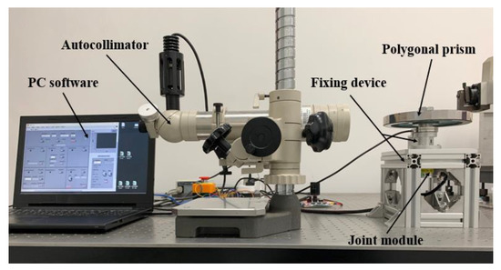 To correct the joint module angle error, a joint module calibration experiment platform was designed and built using the autocollimator and a 36-sided prism, as shown in Figure 3. A fixing device was designed and manufactured to connect the joint module and the 36-sided prism. The bottom of the joint module is fixed and the output shaft is driven by the motor to rotate the prism synchronously. The prism and the autocollimator provide the angle reference for calibrating the joint module angle error.