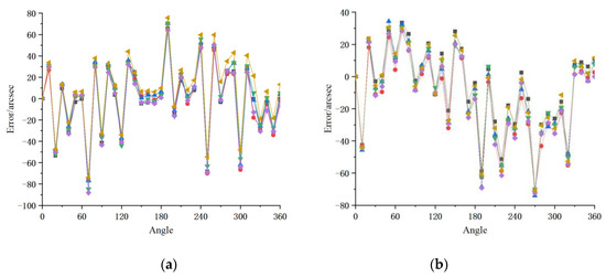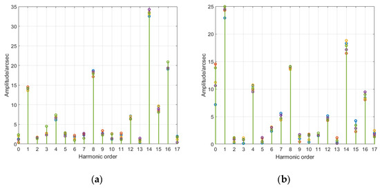 Theoretically, system errors such as eccentric error generally do not change with time and neither do the amplitudes and phases of the corresponding harmonic orders that they cause [36]. Therefore, the order can be determined by combining the phase variation of each order in each group of experiments (see Figure 7). Among them, the phase variations of orders 4, 8, 12, 14, 15 and 16 of joint module a are small at approximately 10°. Combined with orders of large amplitude, it is finally determined that only orders 1, 4, 8, 12, 14, 15, 16 are retained in the error model. The phase variations of orders 1, 4, 6, 7, 8, 12, 14 and 16 of joint module b are also small; combined with orders of large amplitude, it is finally determined that orders 0, 1, 4, 7, 8, 12, 14, 16 are retained in the error model. Therefore, the harmonic expressions of the angle errors of joint modules a and b can be expressed as