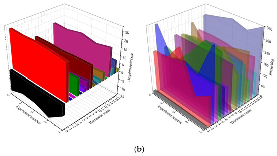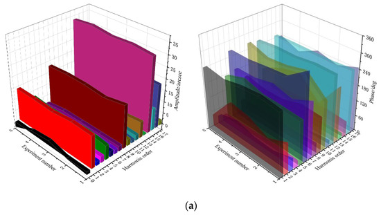 For the 6 groups of measured data, the first 5 groups were used to establish the error compensation model while the last group was used to verify the compensation model effect. First, for each group of measurement data, and in Equation (1) were solved by the least square method to obtain the harmonic amplitude and phase of each order of each group, as shown in Figure 5.