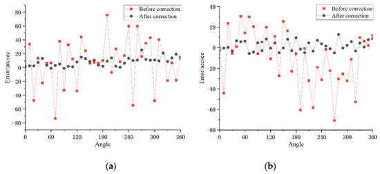Before and after comparison of angle error compensation: (a) joint module a; (b) joint module b.
