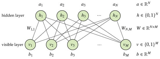 An RBM is a two-layer stochastic NN. This network consists of a visible, or input, layer (visible nodes ) and a hidden layer (hidden nodes ). Values of the nodes are normally Bernoulli-distributed. Each visible node is connected to all hidden nodes using weighted connections, but there are no intra-layer connections. The structure of the RBM is illustrated in Figure 1.