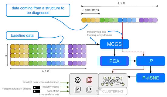 Flowchart of the proposed procedure. Data coming from a structure are first scaled by MCGS and then projected into the PCA model. Finally, P-t-SNE is applied to generate the clusters that will be used in the vibration-based detection and classification of structural changes.