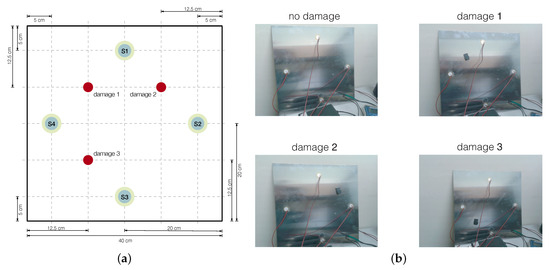 A square aluminum plate was manufactured to demonstrate the accuracy of the vibration-based method of damage detection and classification presented in Section 3 and Section 4. The dimension of the plate is cm. The plate is instrumented with four PZTs and a mass of 17.2916 g is introduced to simulate the damage in a non-destructive way, producing changes in the propagated wave (see Figure 4a). Each PZT can work in two modes: excite the aluminum plate (actuator mode) with a burst signal or detect a time-varying mechanical response (sensor mode). The location of the mass defines each damage, and structural states are considered: healthy state and three different types of damage (Figure 4b). The plate is isolated from the vibration and noise in the laboratory (Figure 4b).