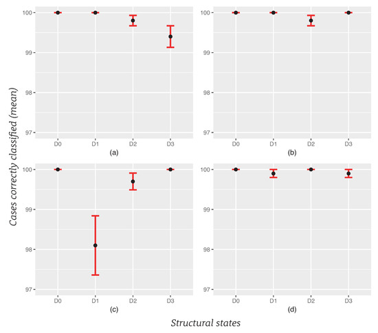 Repeatability of the SHM strategy (10 times), graphs with error bars: (a) scenario 1 and majority voting approach; (b) scenario 1 and sum of the inverse distances approach; (c) scenario 2 and majority voting approach; (d) scenario 2 and sum of the inverse distances approach. : healthy state of the structure; , and : added masses at the positions indicated in Figure 4.