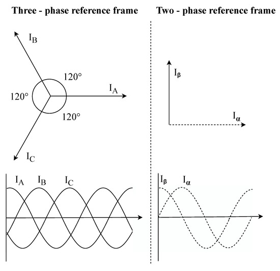 This transformation converts three-phase coordinates a-b-c to two-phase coordinates --0, as shown in Figure 2. The current waveforms obtained by Clarke Transformation serve as a reference for adaptive filtering [63,64]. Transformation itself can be seen in Equation (1) for voltage signals and Equation (2) for current signals.