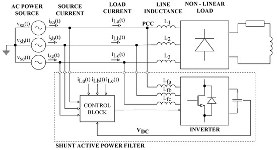 Figure 4 shows a power system configuration containing SAPF. The purpose of SAPF is to compensate for the higher harmonic components contained in the power supply system due to nonlinear loads. The compensation itself occurs by SAPF delivering harmonic components generated by nonlinear loads to the Point of Common Coupling (PCC), but in the opposite phase. The SAPF can also compensate for idle power without any resonance. The SAPF is connected to the power system via an output filter to minimize switching ripples. Further information on SAPF can be found in [54,61,70,71,72].