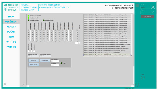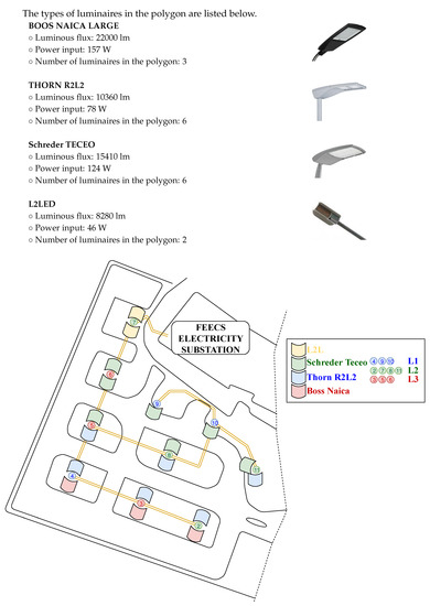 Street lighting is responsible for up to 15% of the national energy consumption [1]. From the perspective of current technologies, the operation of street lighting luminaires is usually very inefficient. Conventional light sources hitherto used for street lighting often operate without the possibility of regulation and illuminate at maximum intensity even when it is not necessary [2,3]. They often emit light even when natural ambient light is fully sufficient for the operation of the infrastructure. This leads to unnecessarily higher operating costs [1,4]. There are several methods of reducing the losses. The most radical method of reducing losses is the general replacement of conventional lighting technology with modern technology [5]. In the case of the test polygon in the VSB–Technical University of Ostrava campus described here, it is a transition from sodium vapor lamps to LED lamps. It is predicted that, between 2020 and 2025, the existing conventional street lighting (predominantly sodium vapor lamps) will become obsolete to a critical level [3]. There are approximately 1.4 million street lighting poles in the Czech Republic and its total value is approximately CZK 98 billion. The annual investment in the entire system is approximately CZK 1.75 billion. According to the Society for the Development of Street Lighting, the estimated lifetime of street lighting is approximately 40 years. For the luminaire itself, it is less than half [4,6].