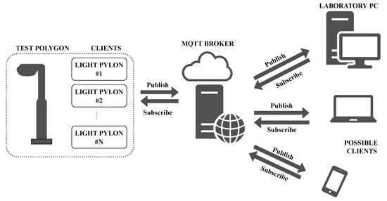 The principle that it operates an is that a device that acts as a client sends messages to, and receives messages from, the server. The filtration of unwanted messages is performed in such a way that the device subscribes only to those subjects on which it is written and ignores others. The subject is called the topic. The part of the message containing the data is called the Message. Each message contains these two items. The server also serves as a data concentrator for all messages from all clients connected. It is called the MQTT broker. Each device can work in three various modes: either it can only receive messages, send messages, or work in both modes. An idea diagram of a currently used MQTT network on a test polygon can be seen in Figure 11.