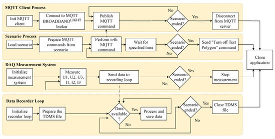 In parallel with the polygon control process, there are 3 other processes running: (1) measurement using the DAQ system, (2) recording of the data measured, and (3) operation of the MQTT communication.