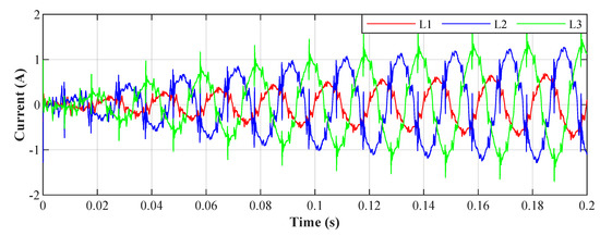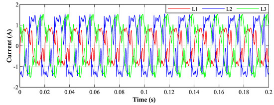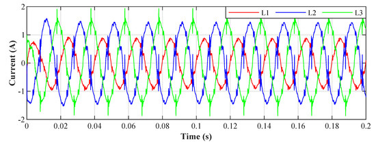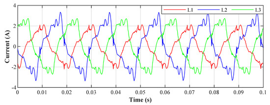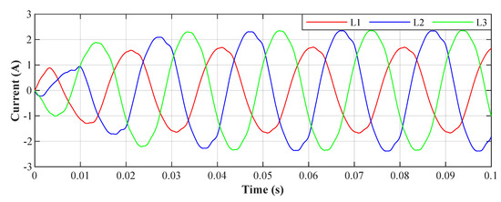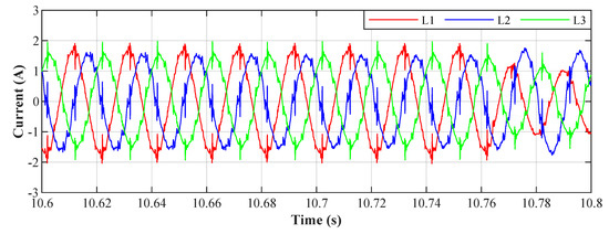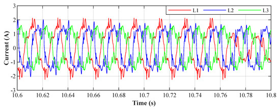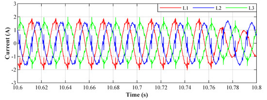 An example of the filtration for all phases for the value , the resulting THDs for the depicted currents correspond to the highlighted column in Table 4. The waveforms of the currents show that the adaptation time is between 40 ms and 50 ms.