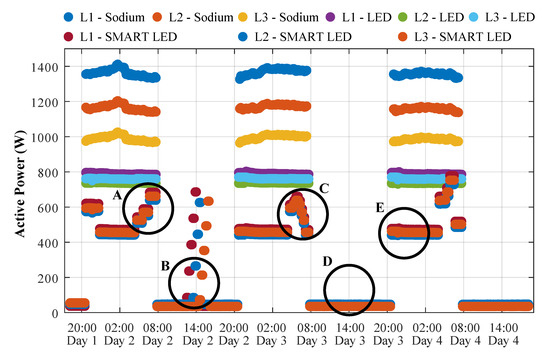 With LED intensity control, there is a problem associated with the behavior of the LED power supplies, which are usually designed and optimized for operation at 100% of the possible power and not, for example, for half power. When operating at lower power, the resulting power consumption of the lighting system decreases, but, on the other hand, the extent of the higher harmonic components of the current is increased, as the power circuits do not operate in an optimum mode. Higher harmonic components of the current subsequently cause a deterioration in the voltage quality due to distribution network impedance, which can cause a number of negative consequences. Negative impacts of poor voltage quality are, for example, shortening the lifetime of some electrical equipment, malfunction of protections, poor functionality of Mass Remote Control (MRC) receivers, or electrical motor overheating [10]. In some cases, it is necessary to choose a compromise between the energy saved and the degree of deterioration in the quality of electricity.