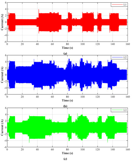 To verify the theoretical assumptions of SAPF, we simulated the extraction of compensating currents , , and . Figure 13 shows a diagram illustrating the experiment with the simulated inverter. Currents , , and and voltages , , and are measured using NI cDAQ-9185 with NI-9205 module. Subsequently, the whole experiment is performed on a PC and the compensating current is obtained. The three-phase signal is first converted using a Clarke transform of and . These signals are then used as the primary inputs of each Notch Adaptive Filter, where the individual phases of the measured signal are used as reference inputs . The error signal is then used as the primary input of in the simulated inverter. Figure 14, Figure 15, Figure 16 and Figure 17 show the results of these simulations. It can be noticed that the noise in the output signal was not completely suppressed. This is due to the artificial delay that has been introduced and corresponds to the latency of the real inverter. The unbalanced three-phase load indicates the testing polygon itself. To provide better conditions for SAPF testing, the polygon was deliberately designed as an unbalanced load.