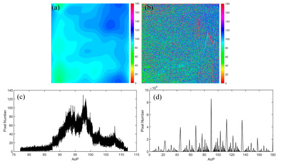 The AoP distribution of the hazy images: (a) after low-pass filtering and (b) before low-pass filtering. Statistical distribution: (c) after and (d) before low-pass filtering.