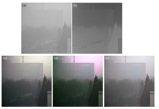 Finally, we can reconstruct the dehazed image with the estimated A and A∞, as shown in Figure 4c. It can be seen that the contrast of the image is enhanced a lot. The visibility of the image is also enhanced, especially for the long-distance building in the top-left corner, which is hardly seen in the original hazy image. This experimental result illustrates the effectiveness of the proposed polarimetric dehazing method. As a comparison, Figure 4d is the reconstructed image using our previously proposed polarimetric dehazing method [12]. Both methods can reconstruct high-quality dehazed images, but it is necessary to tune the bias parameters manually in our previous method. To demonstrate the good quality of the dehazed image using the proposed method, we also compared the dehazing result to that using Y. Y. Schechner’s proposed method [24], as shown in Figure 4e. It can be seen that the quality of Figure 4c,d is better than that of Figure 4e. Note that, the main advantage of the dehazing method proposed in [24] is that it can automatically identify the sky region, however, in their method, the bias parameters still need to be adjusted manually in different hazy environments.