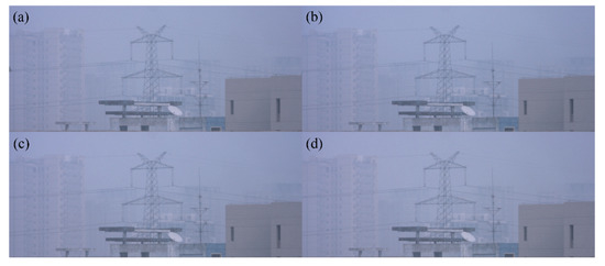 Original captured images in different hazy weather. (a–d) represent the raw hazy images with the polarized orientation of 0°, 45°, 90° and 135°, respectively.