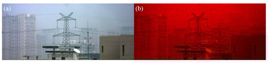 Although both the dehazing methods can obtain good dehazed results, the proposed method does not need to manually tune any bias parameter and thus it is robust. To demonstrate its robustness, the proposed polarimetric dehazing method is used to process the polarized images (Figure 5) captured in a very different hazy weather. Figure 6a,b are the dehazed results using the current proposed method and the previously proposed method with the same bias parameter as that used in Figure 4. We can see that the contrast of Figure 6a is enhanced a lot compared with Figure 5. However, since the bias parameter is not fine-tuned to this group of hazy images, the dehazed result (Figure 6b) of the previously proposed method is much worse than Figure 6b. Note that we can still obtain a better dehazed image using the previously proposed method with the appropriate bias parameter as discussed in [12]. Besides, in Figure 6b, the red background implies that there may be huge errors when calculating the other two channels (green and blue channels). It usually appears when the bias parameters are not suitable for the hazy image.