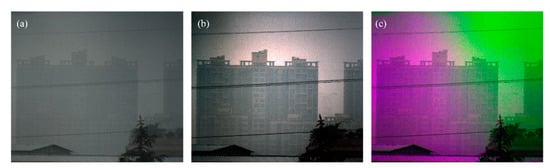 Figure 7a is one of the original polarized images captured with our designed division-of-aperture type polarimetric imaging camera [16]. The transmittance of the imaging lens is not calibrated, and the surrounding pixels of the sensor may be a little darker than the center. This may affect the accuracy of the calculated polarized property. We use this experiment to further show the robustness of the proposed method. Due to the reason that the response of the sensor is different, it is hard to estimate the accurate DoP and AoP based on the raw images, even with tuned bias parameters. Figure 7b,c are the dehazed results using the current proposed method and the previously proposed method with fixed bias parameters, respectively. It can be seen that the quality of Figure 7b is much better than that of Figure 7a,c. The top region in Figure 7b is the sky region, where the value of A is close to A∞. However, similar to Figure 6b, Figure 7c shows strange colors in different regions, which implies the bias parameters used in red green blue (RGB) channels may also be different to use of the previous method. As a contrast, we don’t need to set the bias parameter in the current method, but good dehazed result can be obtained.