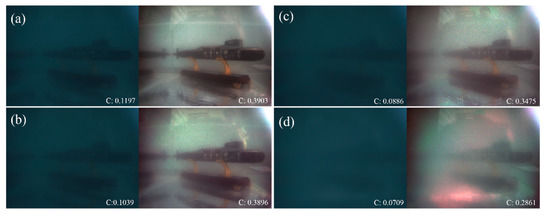 In addition to processing the images under different hazy weather, we also evaluate the performance of the proposed polarimetric dehazing method in processing the images under the scattering underwater environment. We use the submarine model as the target and simulate different scattering conditions with magnesium oxide (MgO). In this experiment, another pixelated underwater polarization camera is used to capture images. Figure 8a–d show the original intensity images (left) and the dehazed images (right) under different scattering conditions. It can be seen that the image quality can be improved significantly at all scattering conditions. The contrasts of the images are also shown in Figure 8. It can be seen that all the contrast of the dehazed images are enhanced a lot, over 3 times compared with that of the hazy images.