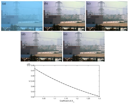 Experimental results with different coefficients of A∞. (a) Original intensity image; (b)–(e) dehazed images with the coefficient of 1.01, 1.05, 1.2 and 1.3, respectively; and (f) the relationship between the contrast (C) and the coefficient of A∞.