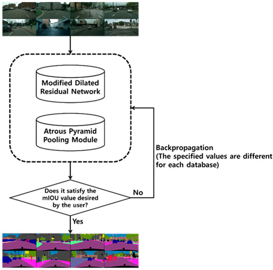 In this study, we used a modified dilated residual network, atrous pyramid pooling module, and backpropagation to improve the accuracy of semantic segmentation. Specifically, we first applied dilated convolution and the atrous pyramid pooling module to improve accuracy by extracting feature maps that retain considerable spatial information. Second, we improved accuracy by repeatedly performing backpropagation with an accuracy value in terms of mean intersection over union (mIOU) desired by the user. Figure 1 shows the overall structure of the proposed novel method of semantic segmentation applicable to AR.