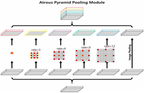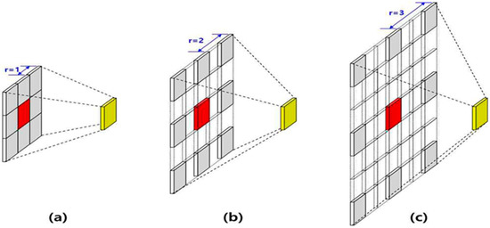 Convolution is the most representative algorithm for extracting features from images while maintaining as much spatial information as possible. One of the methods, atrous convolution, was named from the French word “atrous” (having a hole). Influenced by wavelet analysis, zero-padding was added in the filter to increase the window size without increasing the number of weights. Atrous convolution captures large features with the same amount of computation as that used in general convolution and can extract more spatial features by using atrous convolutions with various expansion ratios in parallel. Equation (1) describes the case in which the rate is one, representing general convolution, and Equation (2) describes the case in which the rate is larger than one, representing atrous convolution. Figure 5 illustrates the atrous convolutions in which the rate is one, two, or three. In Equations (1) and (2), is a discrete function, is a discrete filter of size , and is a dilation factor [23].