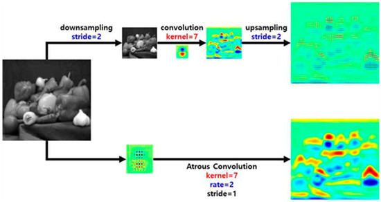 The accuracy decreases if semantic segmentation is performed with small feature maps obtained using a general convolution network. Figure 6 shows the difference between performing semantic segmentation through down-sampling, convolution, and up-sampling and performing semantic segmentation through atrous convolution. The illustration of general convolution shows that the resolution of semantic segmentation is decreased by up-sampling, with loss of spatial information. However, atrous convolution can minimize the loss of spatial information and increase the resolution by performing convolution with a large receptive field.