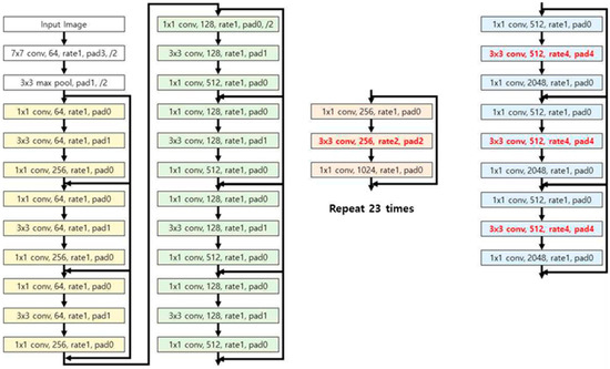 In this study, feature maps were extracted using a modified dilated residual network constructed by modifying the ResNet-101-step network structure to improve accuracy. The modified dilated residual network learns long-distance features without depending on the pooling function by expanding the kernel with empty weights, and maintains more detailed elements of a higher space frequency even without pooling. Figure 7 shows the structure of the modified dilated residual network applied in this study. The network was built by converting the convolution of Group 4 and Group 5 of the Resnet-101 steps to dilated convolution with two and four rates. Through this, feature maps with better spatial information can be extracted.