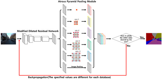 The main contributions of this study are as follows. (1) A diluted residual network process that extracts feature point maps from the original image using atrous convolution, which transforms the composition to maximize spatial information and extracts feature points. This improves the accuracy of semantic segmentation by reducing the loss of space information. (2) An atrous pyramid pooling module process that applies various atrous convolutions to feature point maps to effectively extract objects with small areas of the image. In addition, to reduce the time required, the atrous convolution is placed in parallel to extract the feature points and is then stacked in the shape of a pyramid. During this process, small feature point maps are stacked equally with up-sampling. When the various feature point maps are stacked in the pyramid shape, 1 × 1 convolution is applied to make them into one-channel feature point maps. This improves accuracy because even small objects can be extracted more accurately. (3) A diluted residual network backpropagation process that compares the semantic segmentation obtained from the final feature point map with the resulting image provided by the database and, if a certain error rate occurs, applies it to the convolution performed in the second process to reduce the error rate, ultimately enhancing the accuracy of the semantic segmentation.