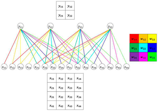 The backpropagation process is as follows. The CNN extracts features while the filter slides the input data, compresses them by max pooling or average pooling, and sends them to the next layer. The general structure of the CNN causes the process to repeat. The input is a 5 × 5 matrix, in which denotes the element in the row and column. When convolution is performed on this input with a filter size of 3 × 3, the output has the size 2 × 2. Figure 10 illustrates an example in which 3 × 3 convolution is performed when the input image is 5 × 5, indicating that the value is output by the convolution of , , , , , , , , and .