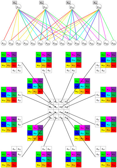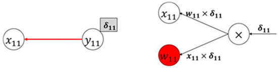 Figure 11 shows backpropagation based on the convolution structure. In the forward process, performs convolution only with weight of the 3 × 3 filter; backpropagation is only performed once. This backpropagation process can be represented in a Karpathy calculation graph, as shown in Figure 11. The gradient of can be determined by multiplying the inflow gradient by the local gradient (), which indicates the change in the other party. Likewise, the gradient of can be determined by multiplying the inflow gradient by the local gradient ().
